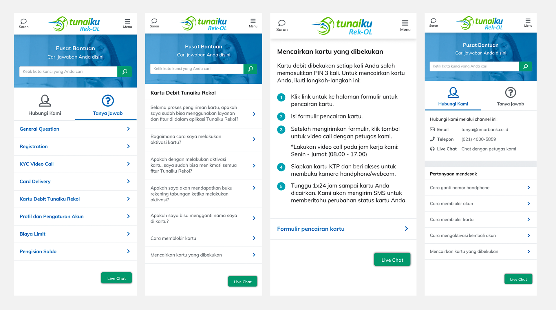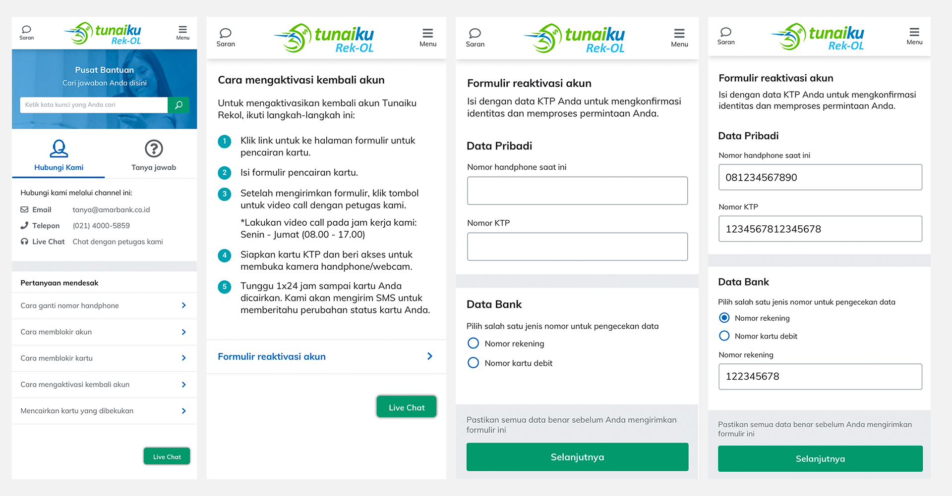 Below are some of the mockups created for the account creation flow and Help Center. Given that Help Center is hosted on the same website as Tunaiku, we had to rebrand it as "Tunaiku's Savings Account" to place it as part of Tunaiku's ecosystem. This would be corrected in the future phase (once Senyumku has its own website).