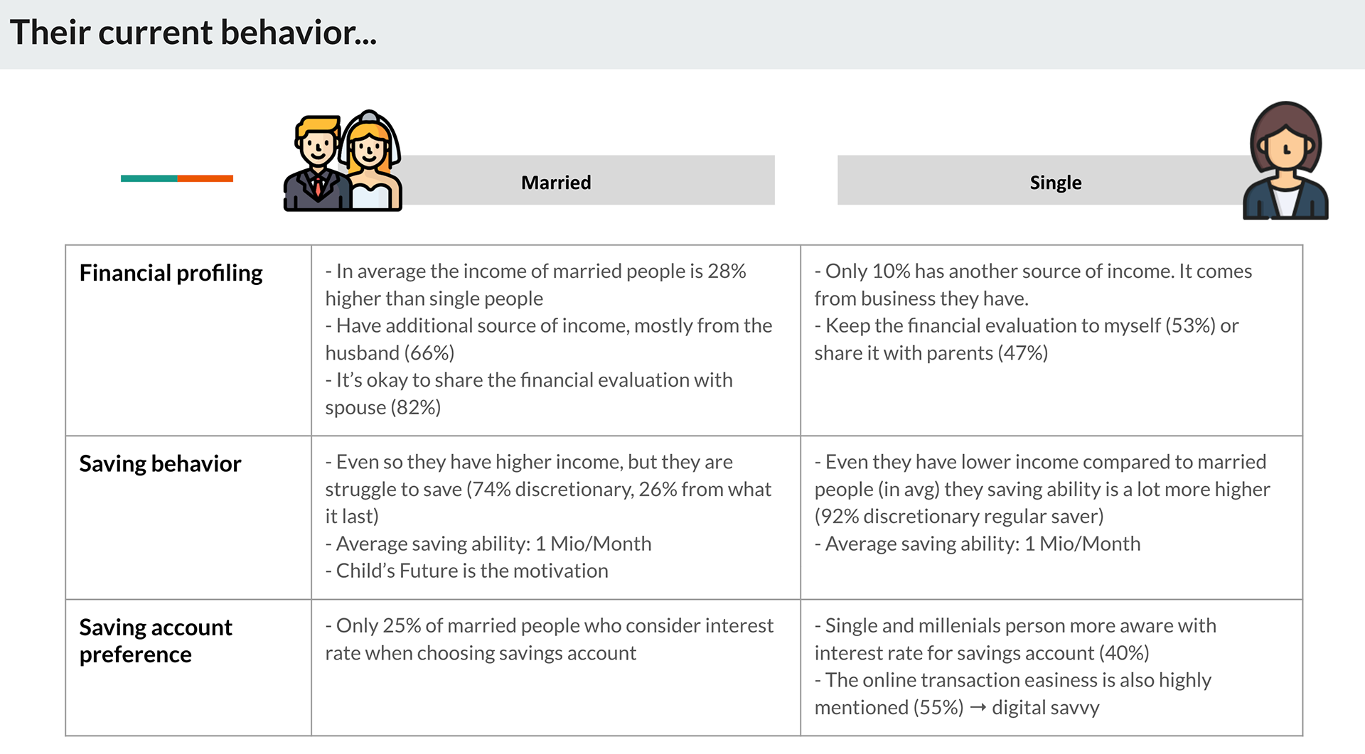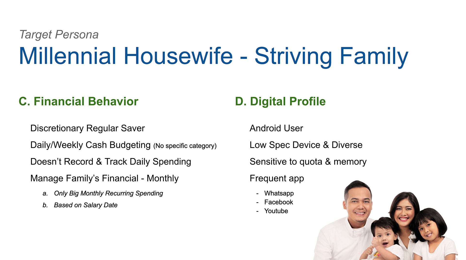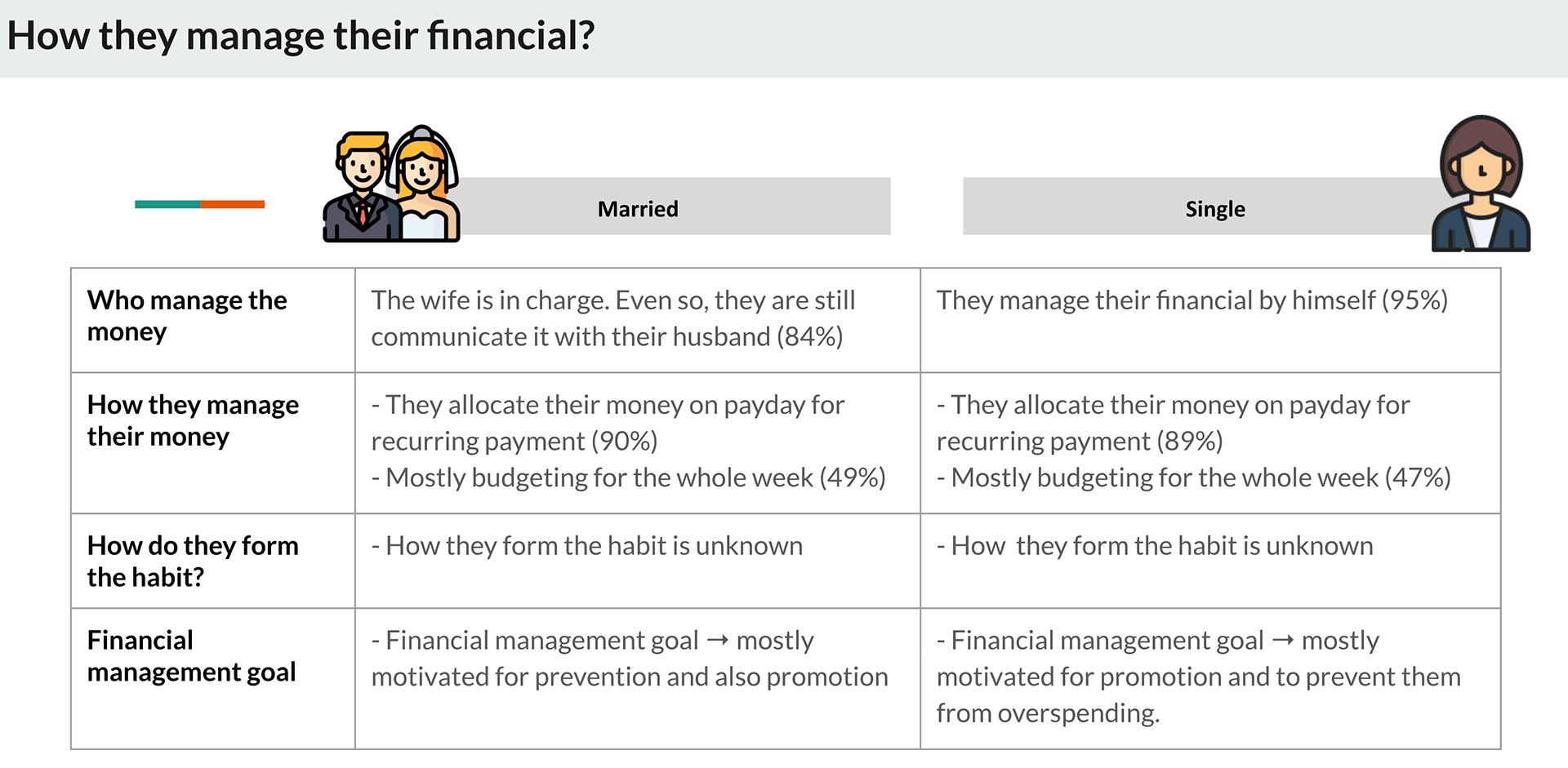 • Indonesian urban millennials, especially the married ones, was our primary segment as they have a stronger predisposition to save and manage their finance more regularly.