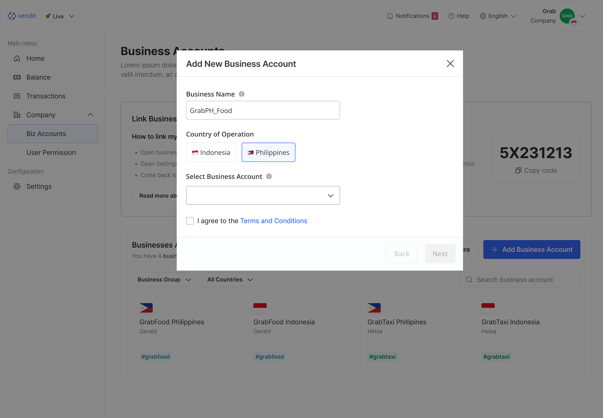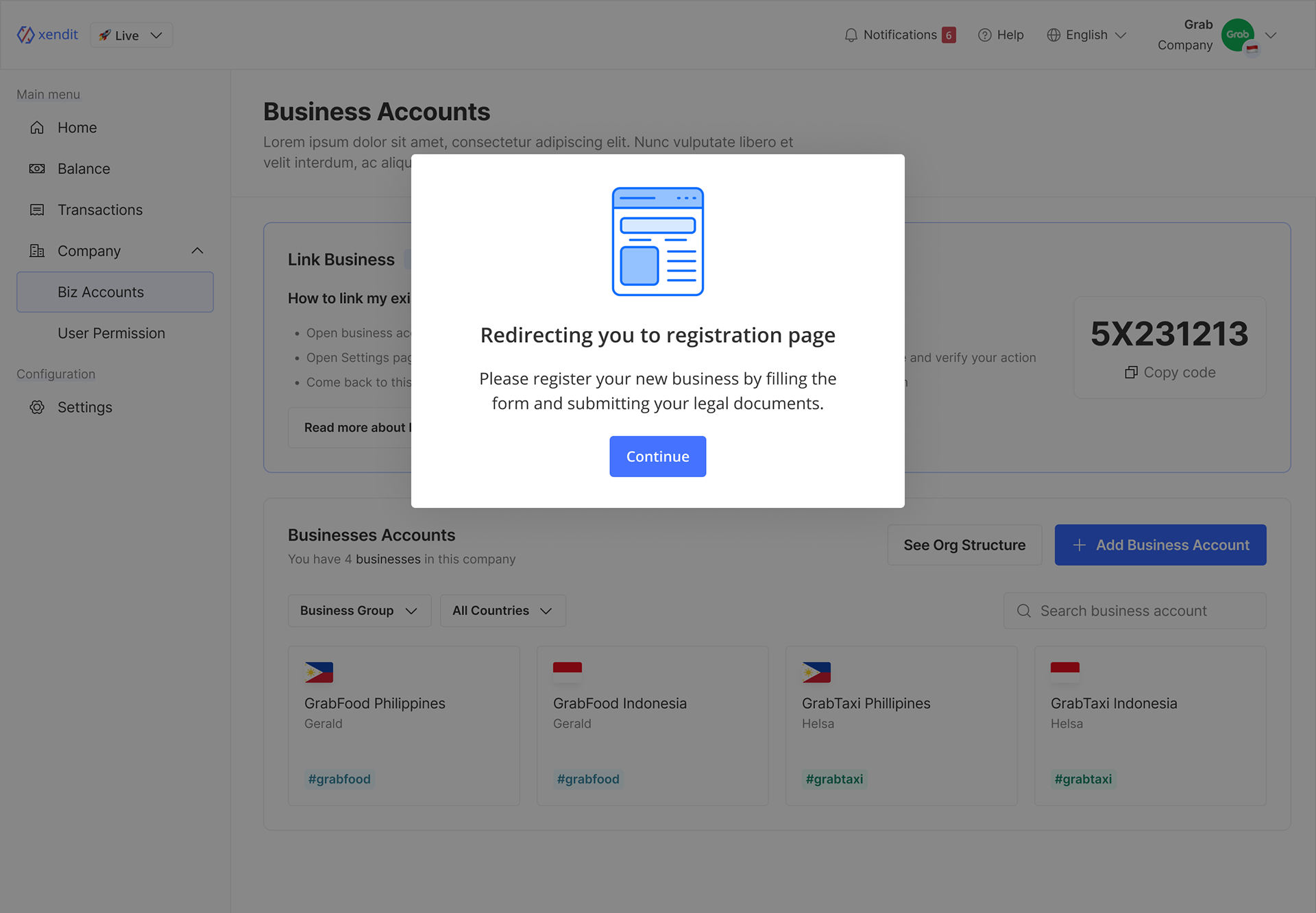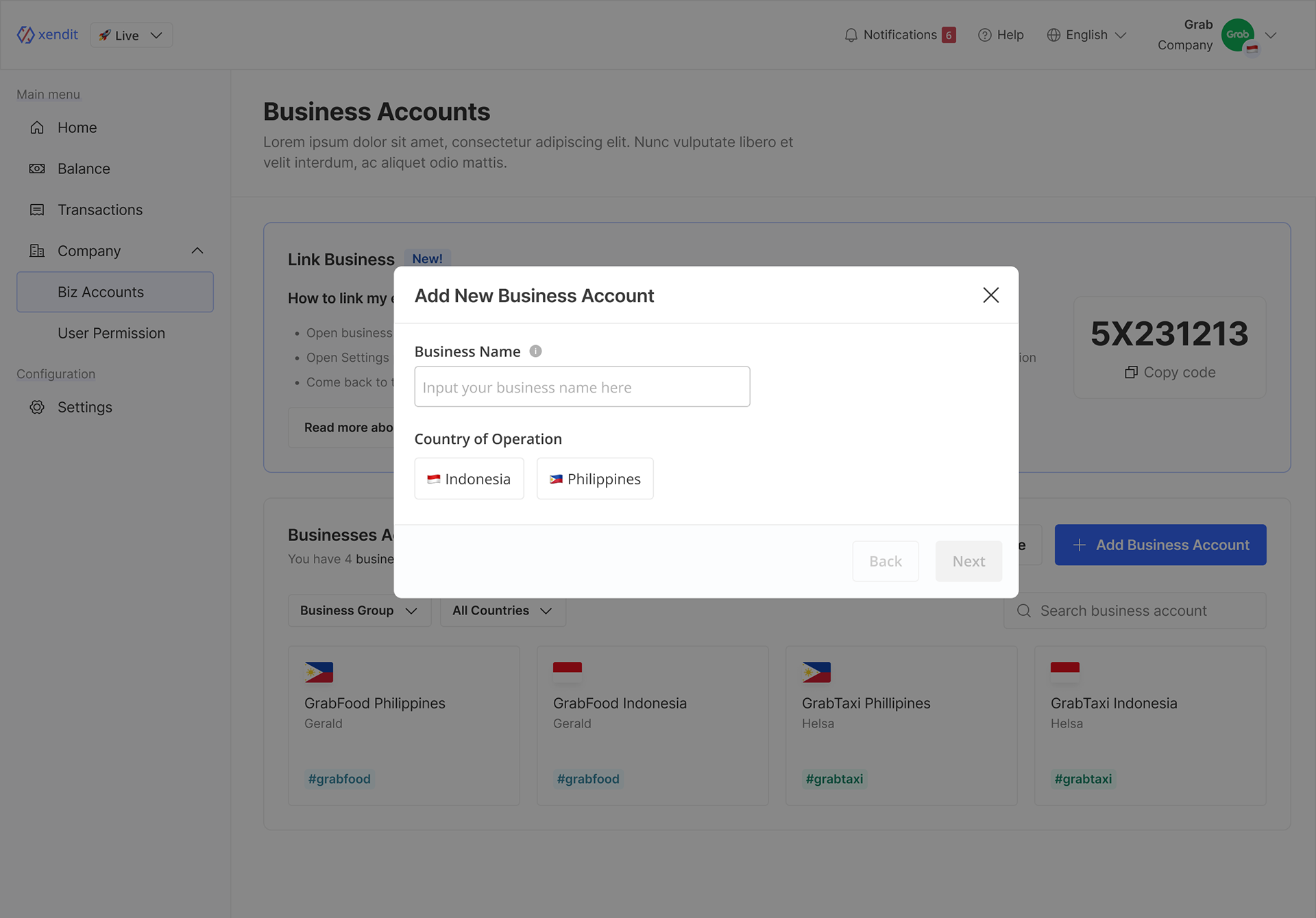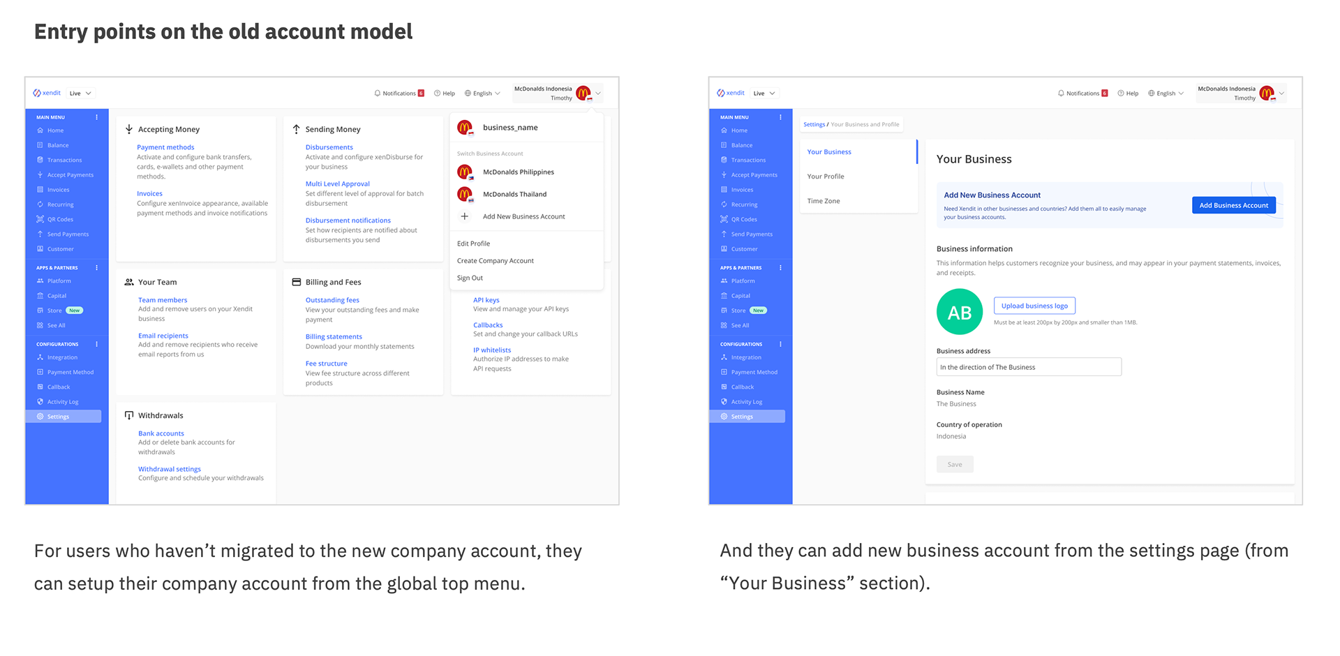 Existing merchants can access the account creation setup from their current account settings and global menu. Once triggered, they can create new business account and setup the company one on their own.