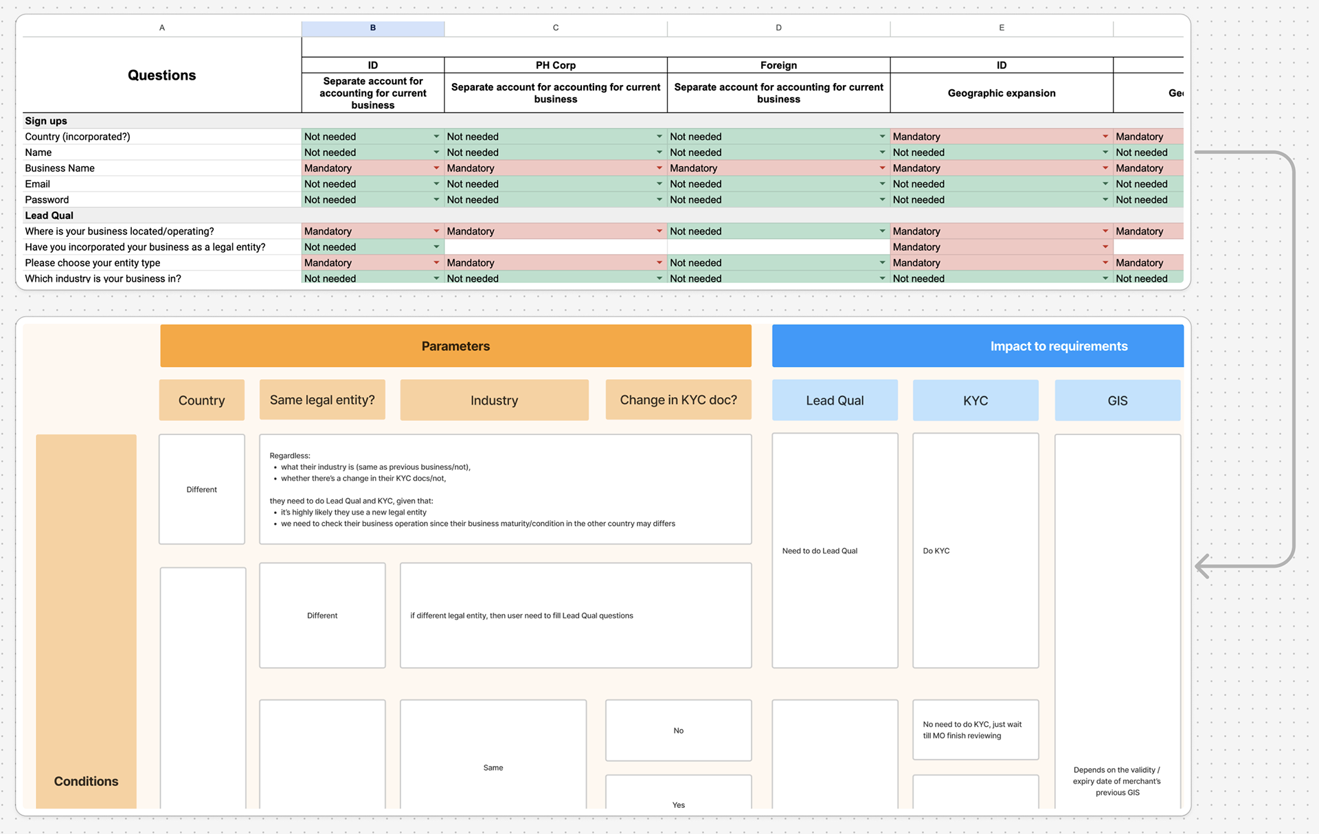 To reduce the number of steps that users have to go through, I evaluated the necessity of Xendit's preliminary questions across different variables (that affects the requirements):