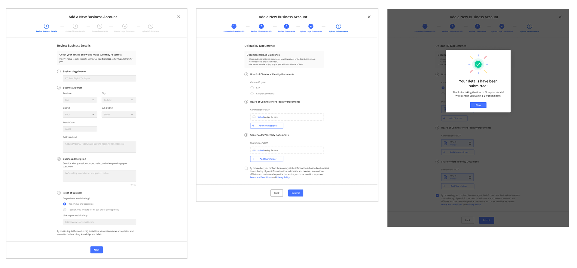 This project was part of Xendit's initiative in driving their regionalization in Southeast Asia. Our team was consisted of two UX researchers, two product managers and another product designer. I served mainly as the UX strategist, whose task was designing the account structure and account creation flow.