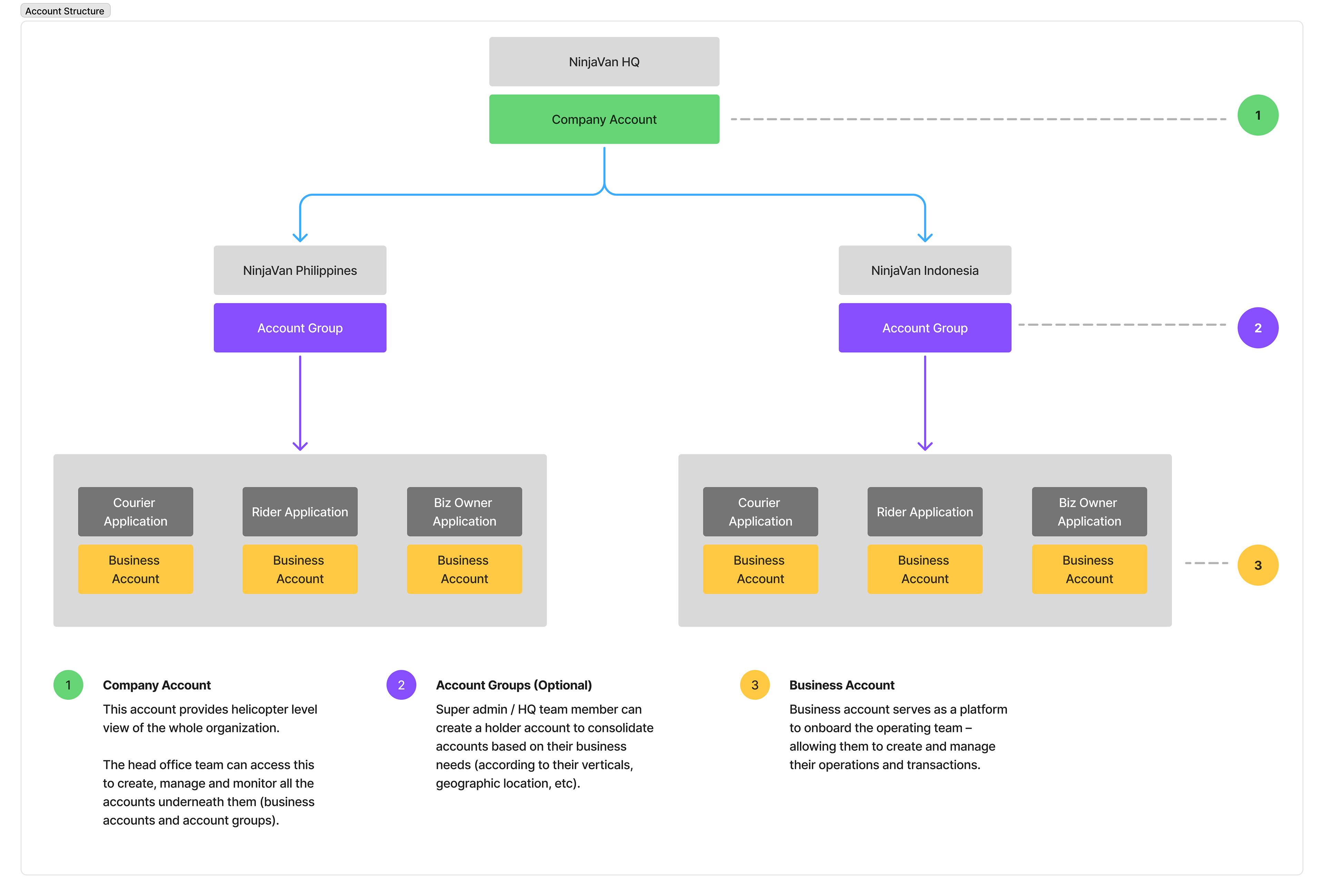 NinjaVan operates across multiple countries and verticals (e.g., transport, delivery, etc). Each country’s headquarter acts as a parent entity overseeing several sub-accounts, representing its various business lines. This structure supports: