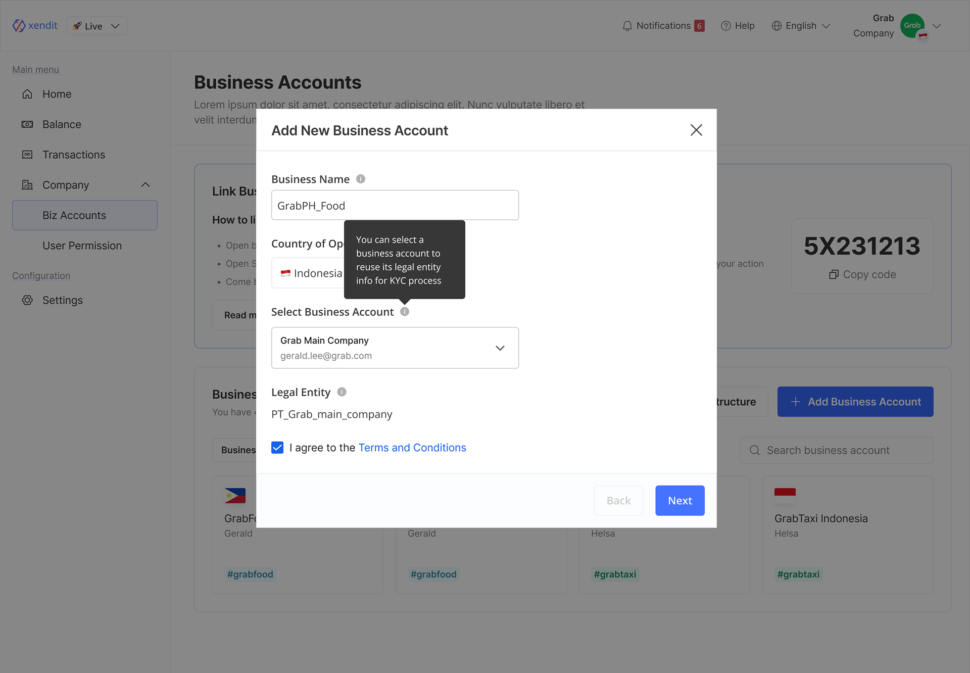 New merchants can be onboarded directly to the new company account and business account through manual engineering process. Given that this MVP is still on testing phase, we only offered this to selected merchants that suit our profile criteria.