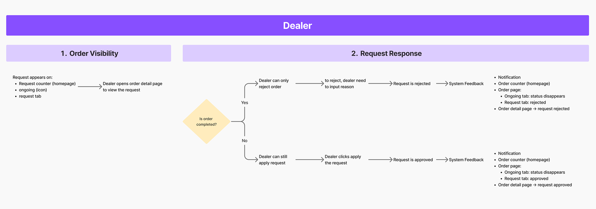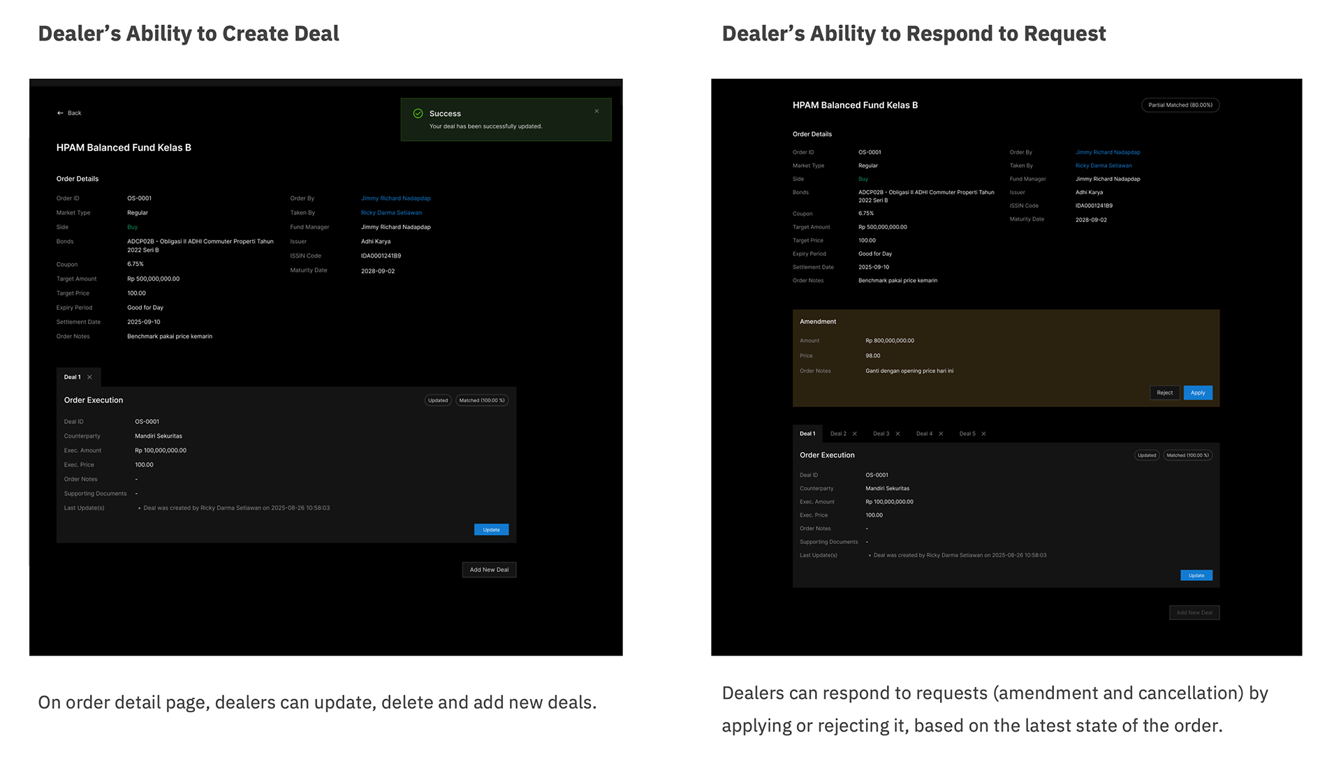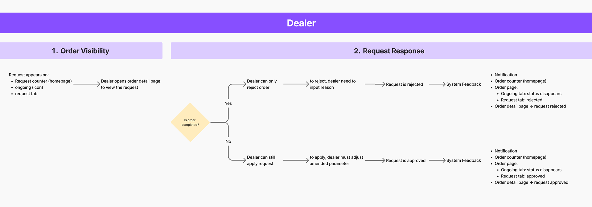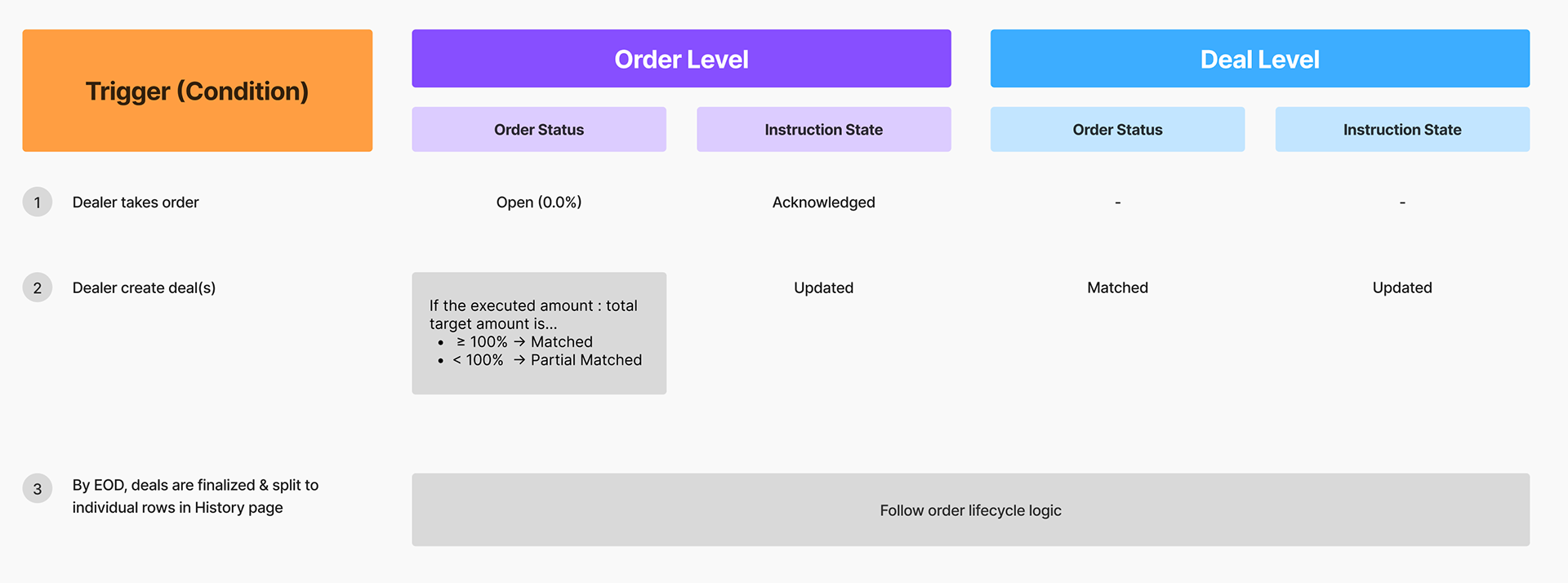 I redesigned the order execution flow that suits dealer's practice, while also breaking it down to steps that can be systemized. This ensures the execution flow has clear status transition cycle – system can map out the relationship between user action and its order status movement.