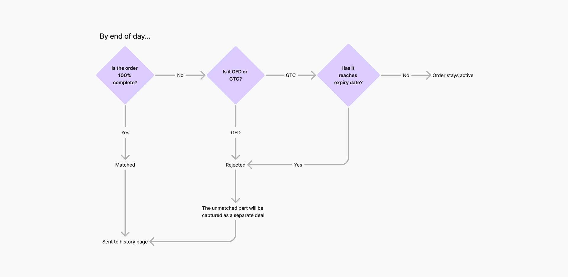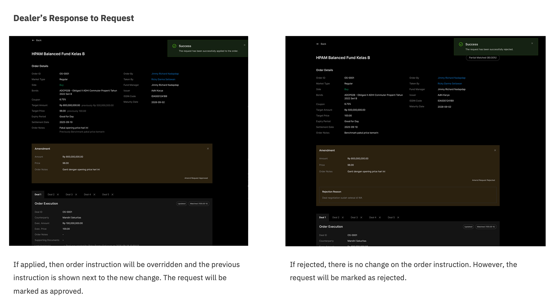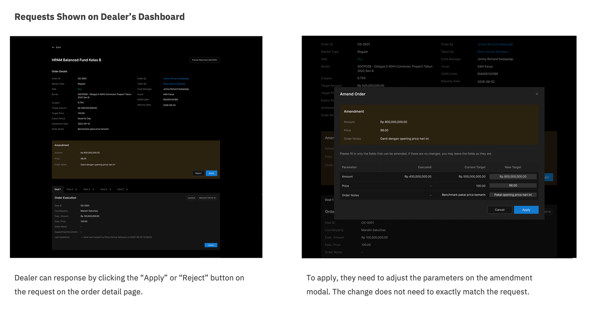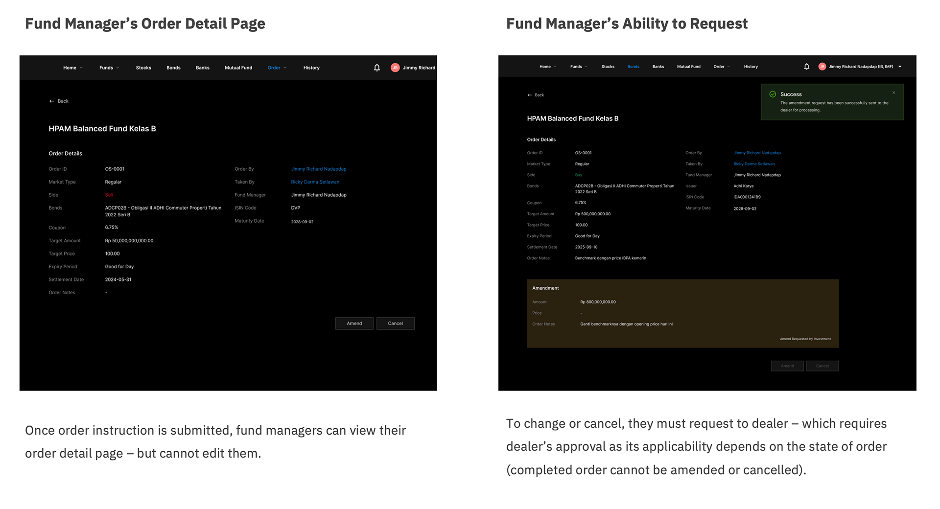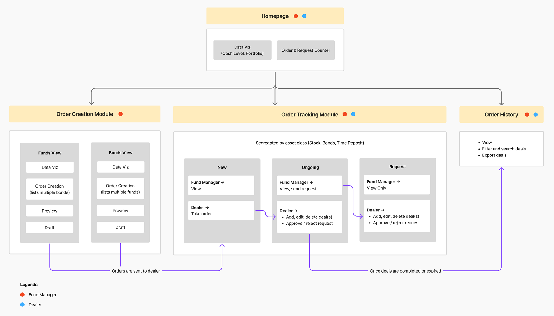 I redesigned the order execution flow that suits dealer's practice, while also breaking it down to steps that can be systemized. This ensures the execution flow has clear status transition cycle – system can map out the relationship between user action and its order status movement.