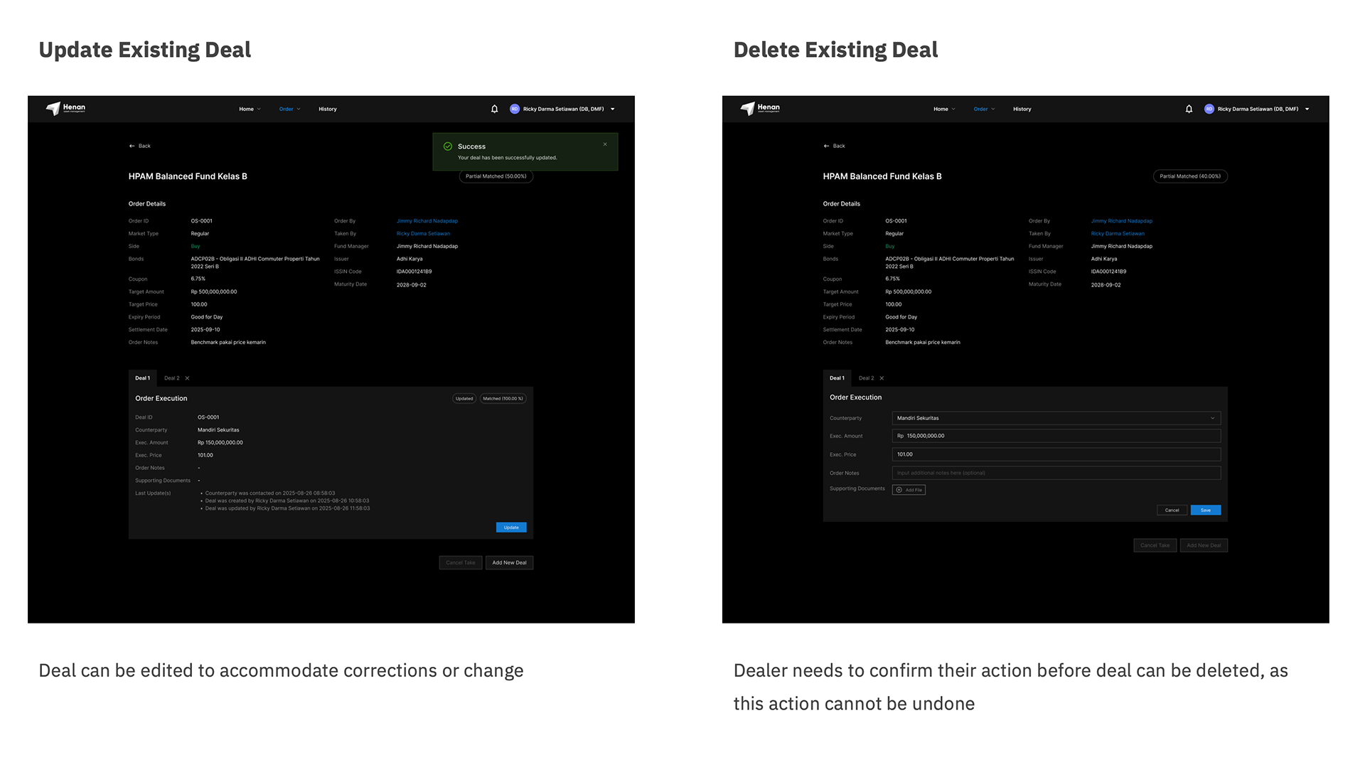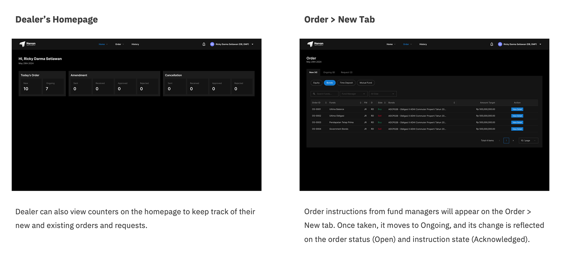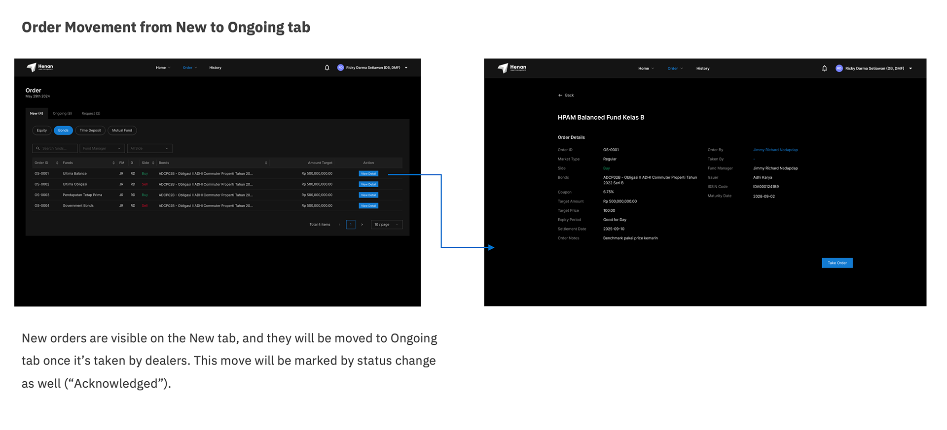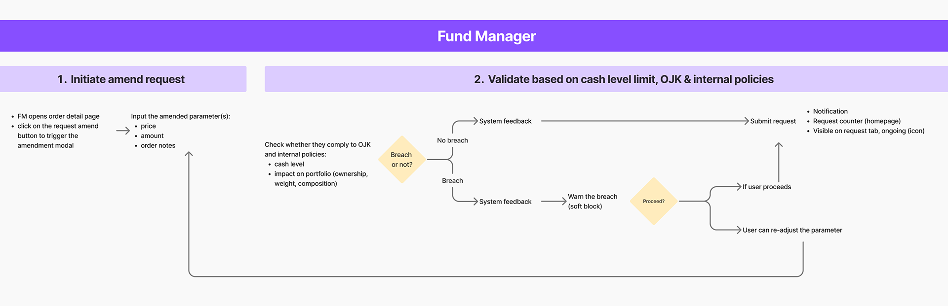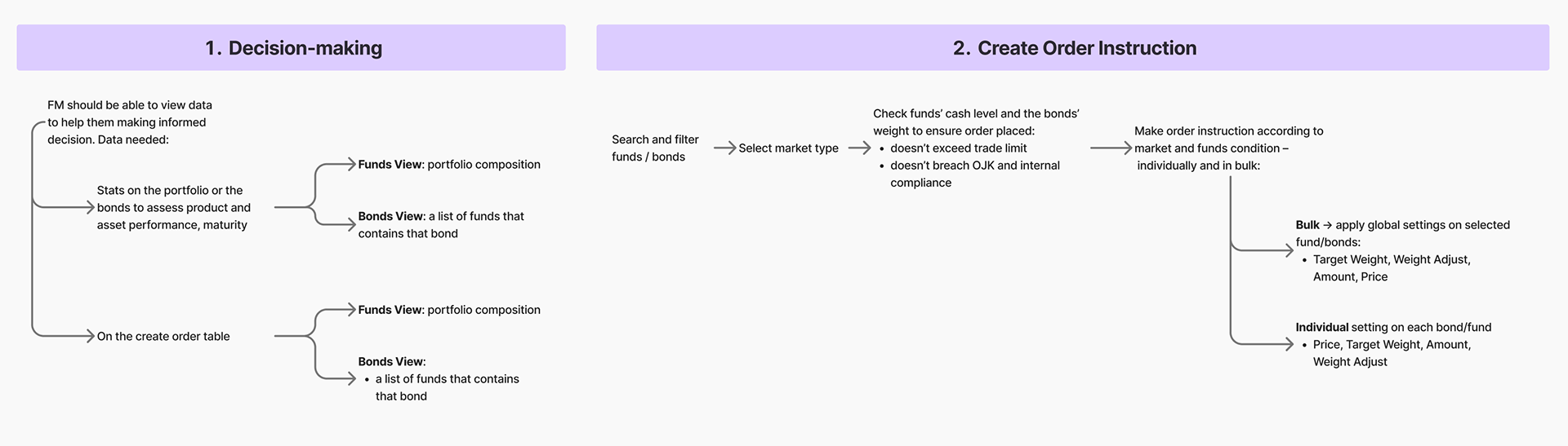 I redesigned the order execution flow that suits dealer's practice, while also breaking it down to steps that can be systemized. This ensures the execution flow has clear status transition cycle – system can map out the relationship between user action and its order status movement.