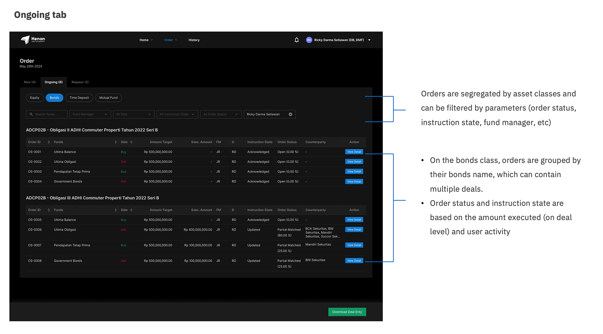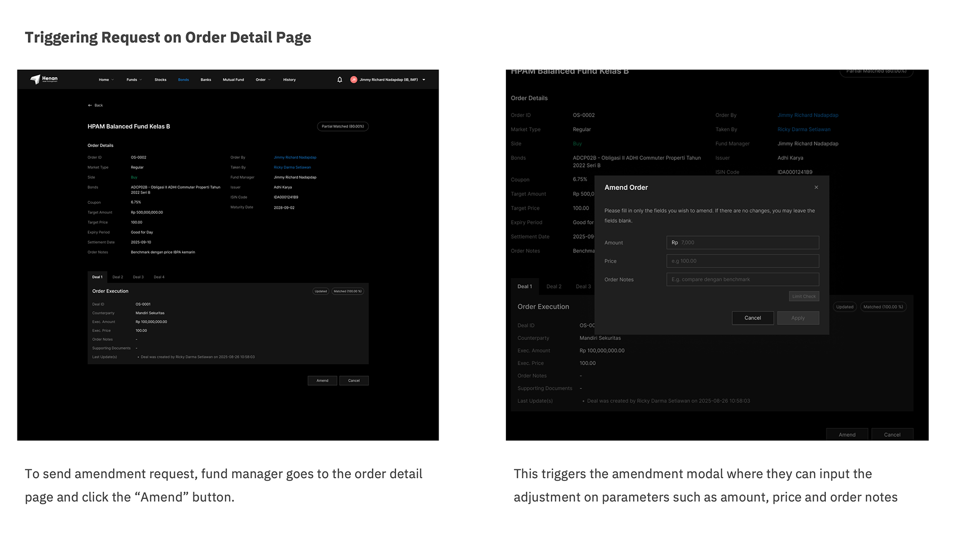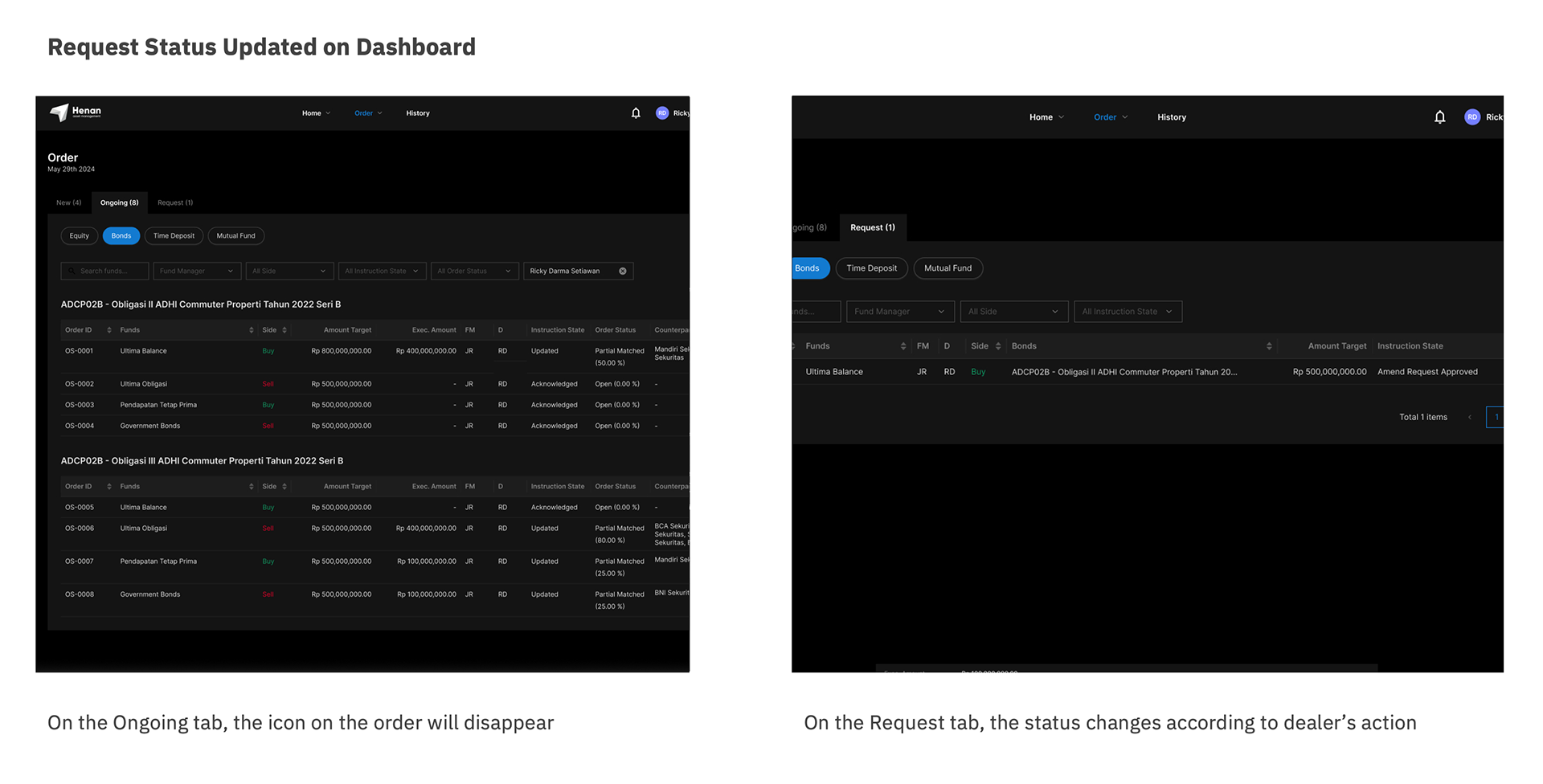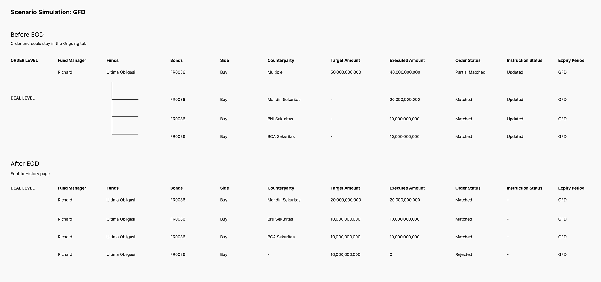 I redesigned the order execution flow that suits dealer's practice, while also breaking it down to steps that can be systemized. This ensures the execution flow has clear status transition cycle – system can map out the relationship between user action and its order status movement.