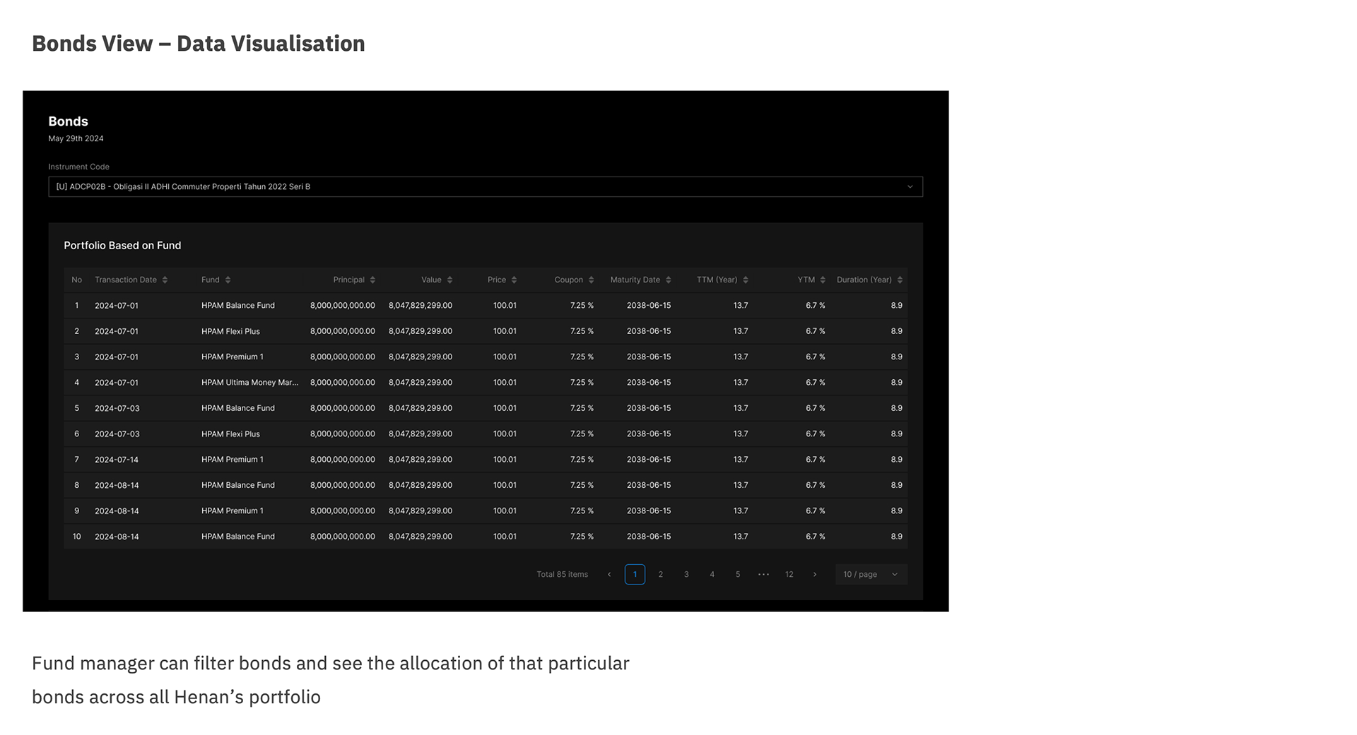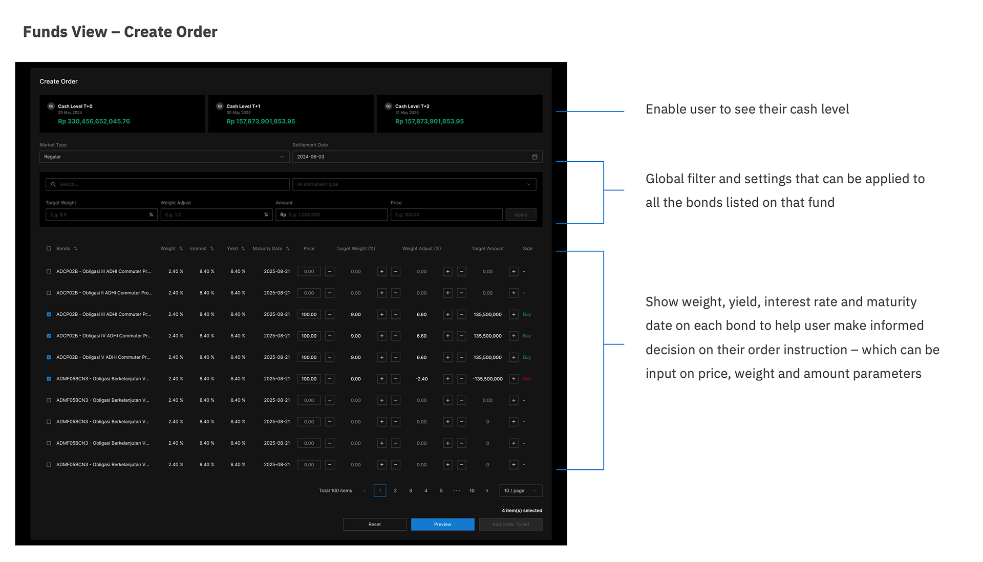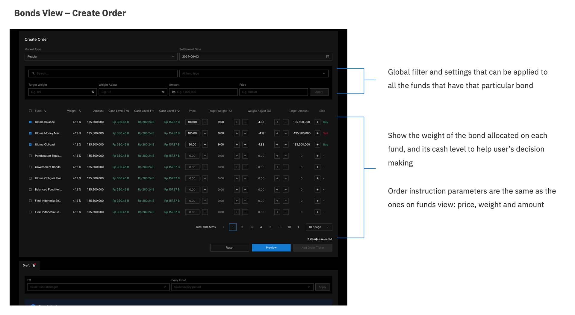 Fund manager can create order instruction from both Funds View and Bonds View page. On both pages, there's global settings and individual parameters on each row to enable them to apply and create orders on bulk, or manually through granular settings.