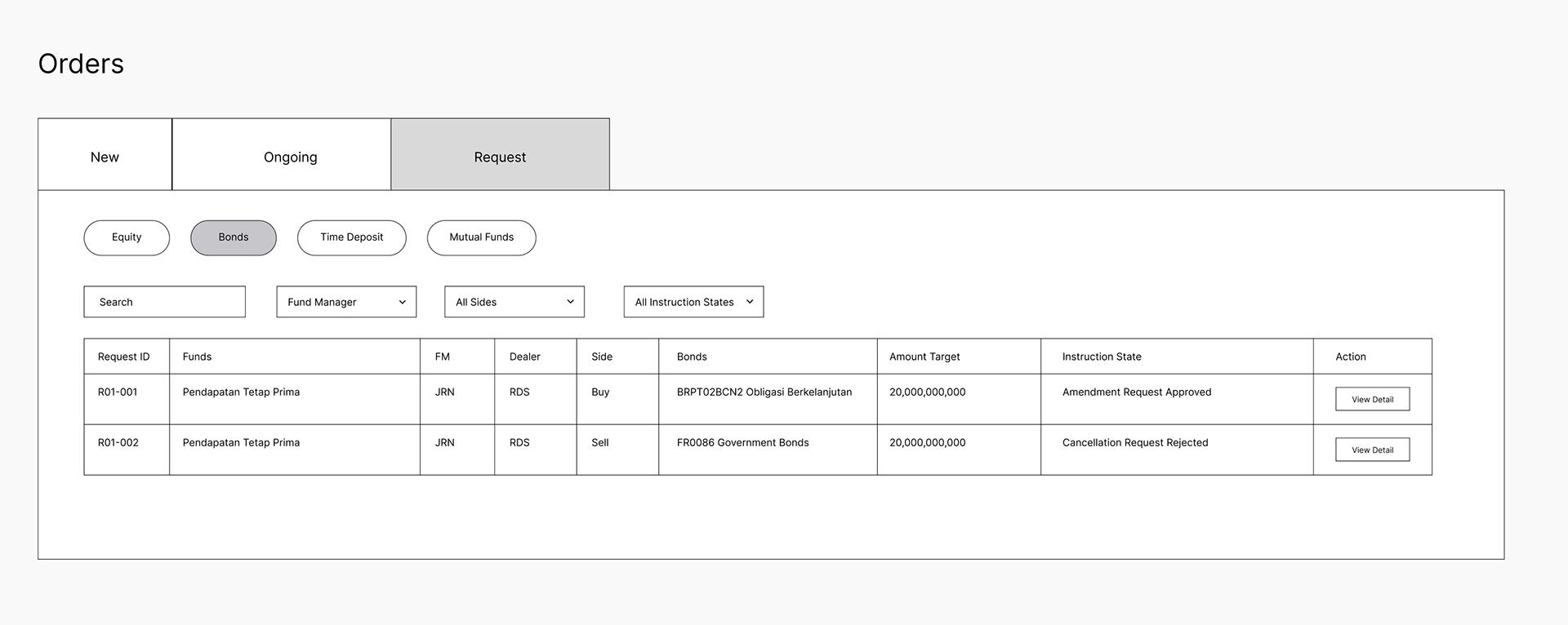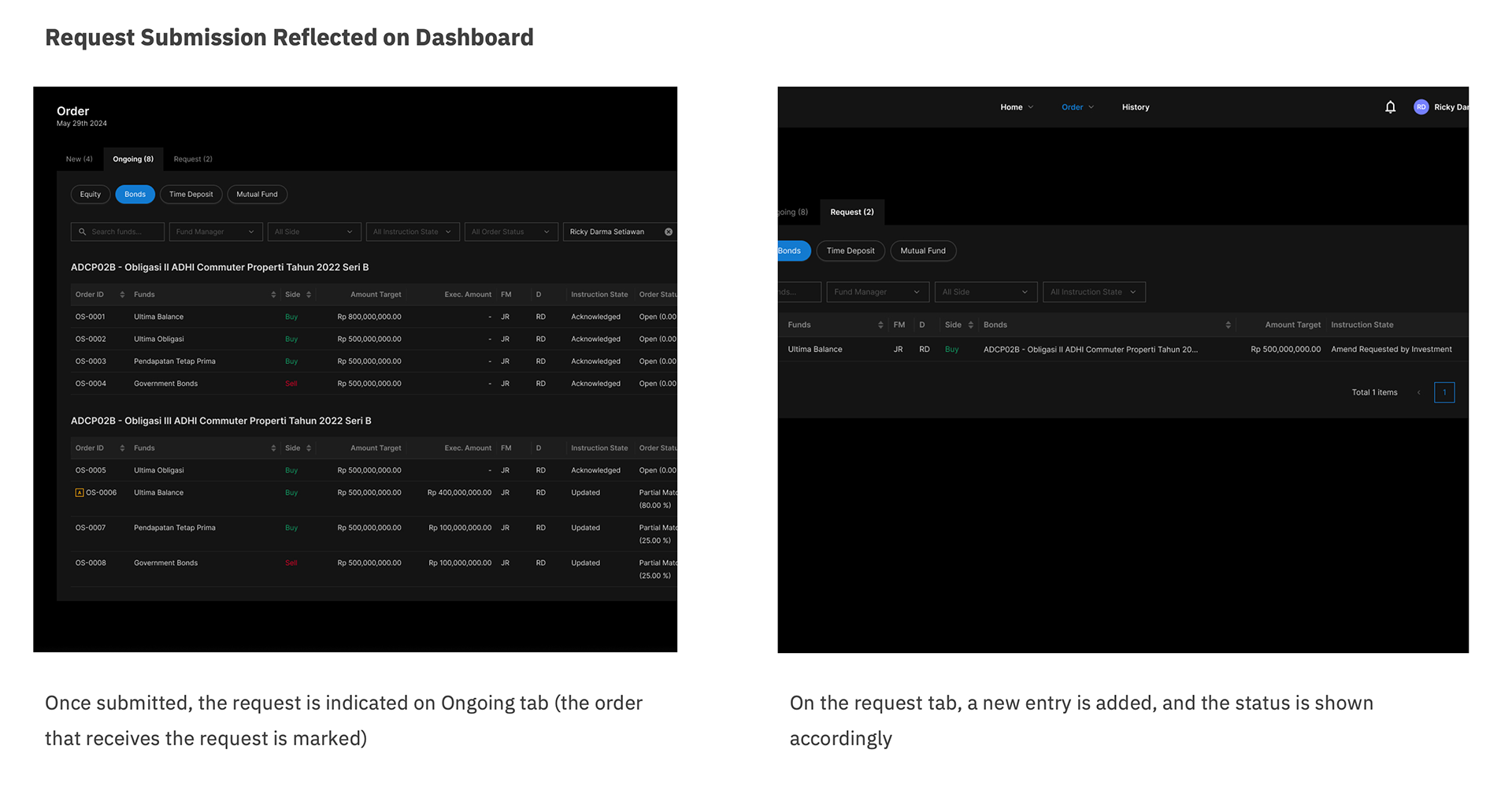 Request tab serves as a singular tracker for all amendment and cancellation requests – allowing fund manager and dealing team to keep track of the request status (requested, approved, rejected).