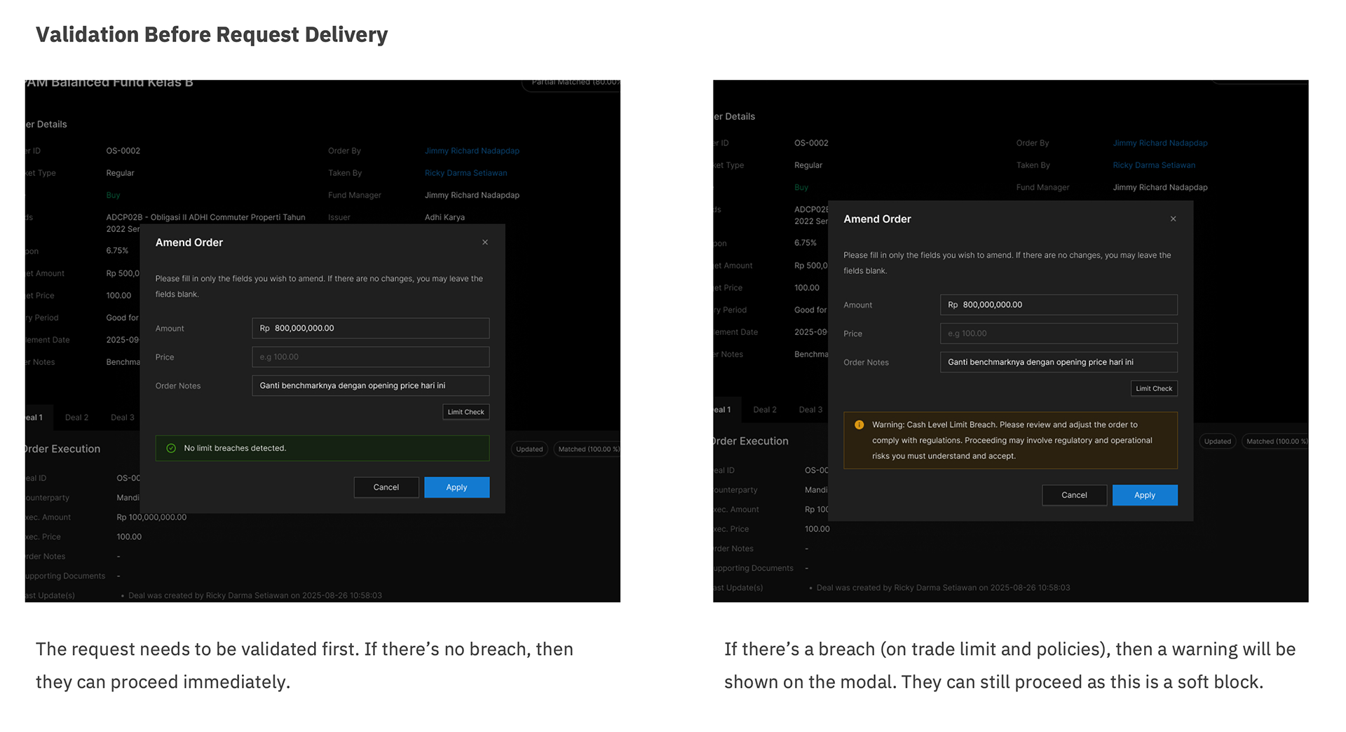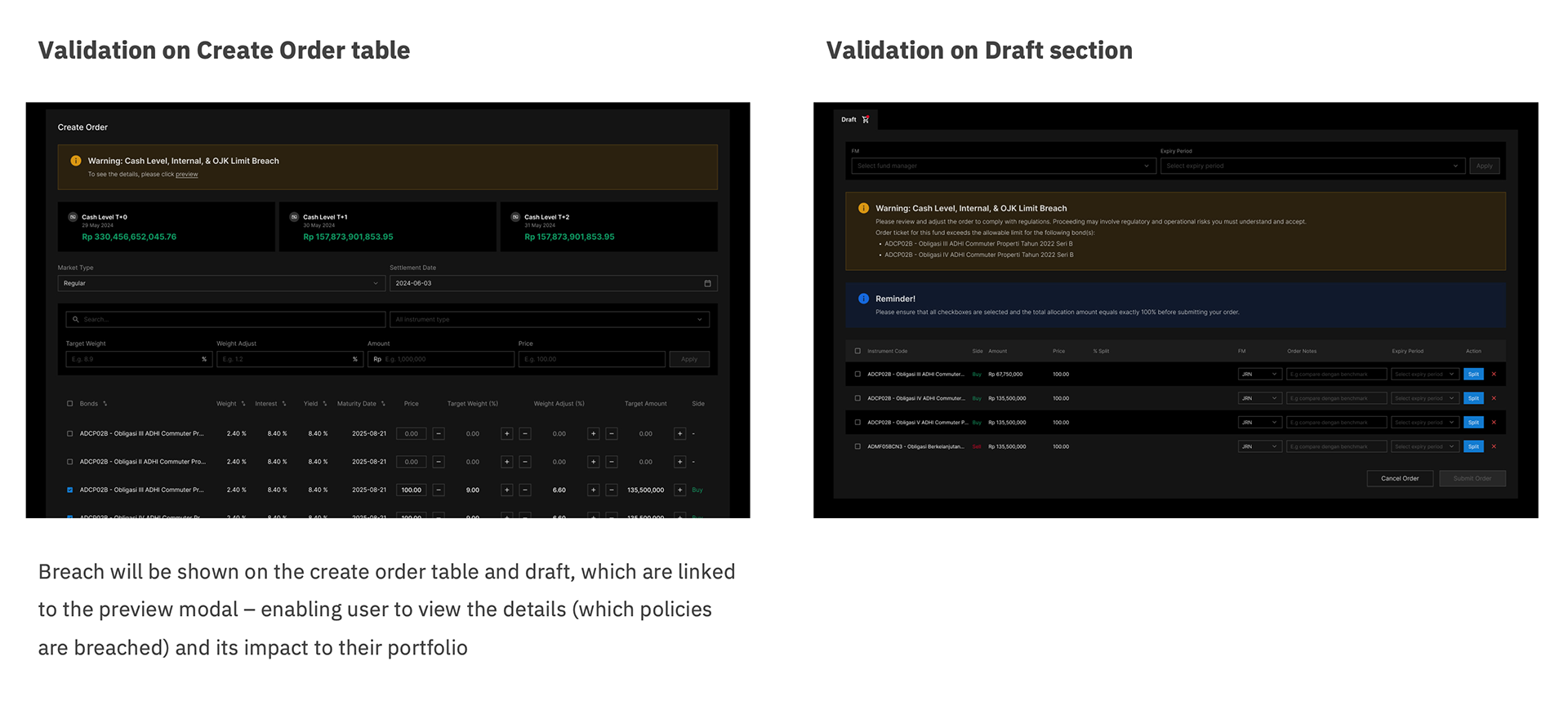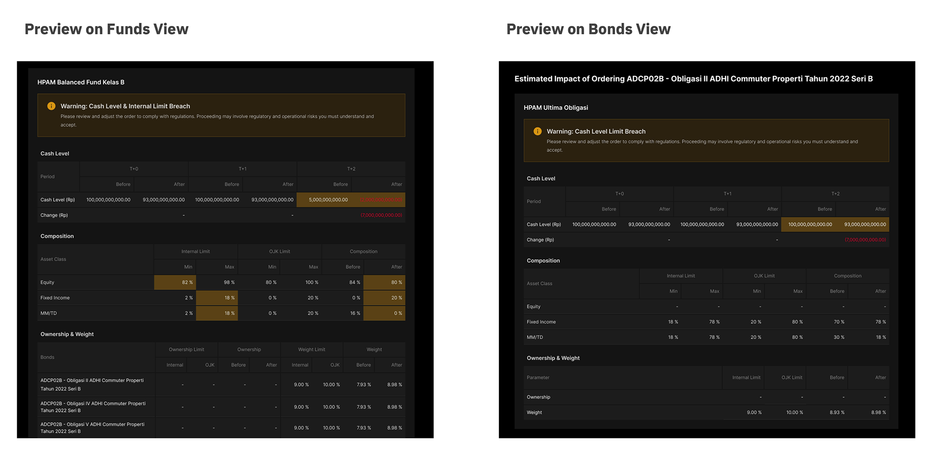 Provide validation on multiple touch points to prevent user from exceeding cash limit or breaching OJK regulations and internal policies. They can also view the impact of their order instructions through preview.
