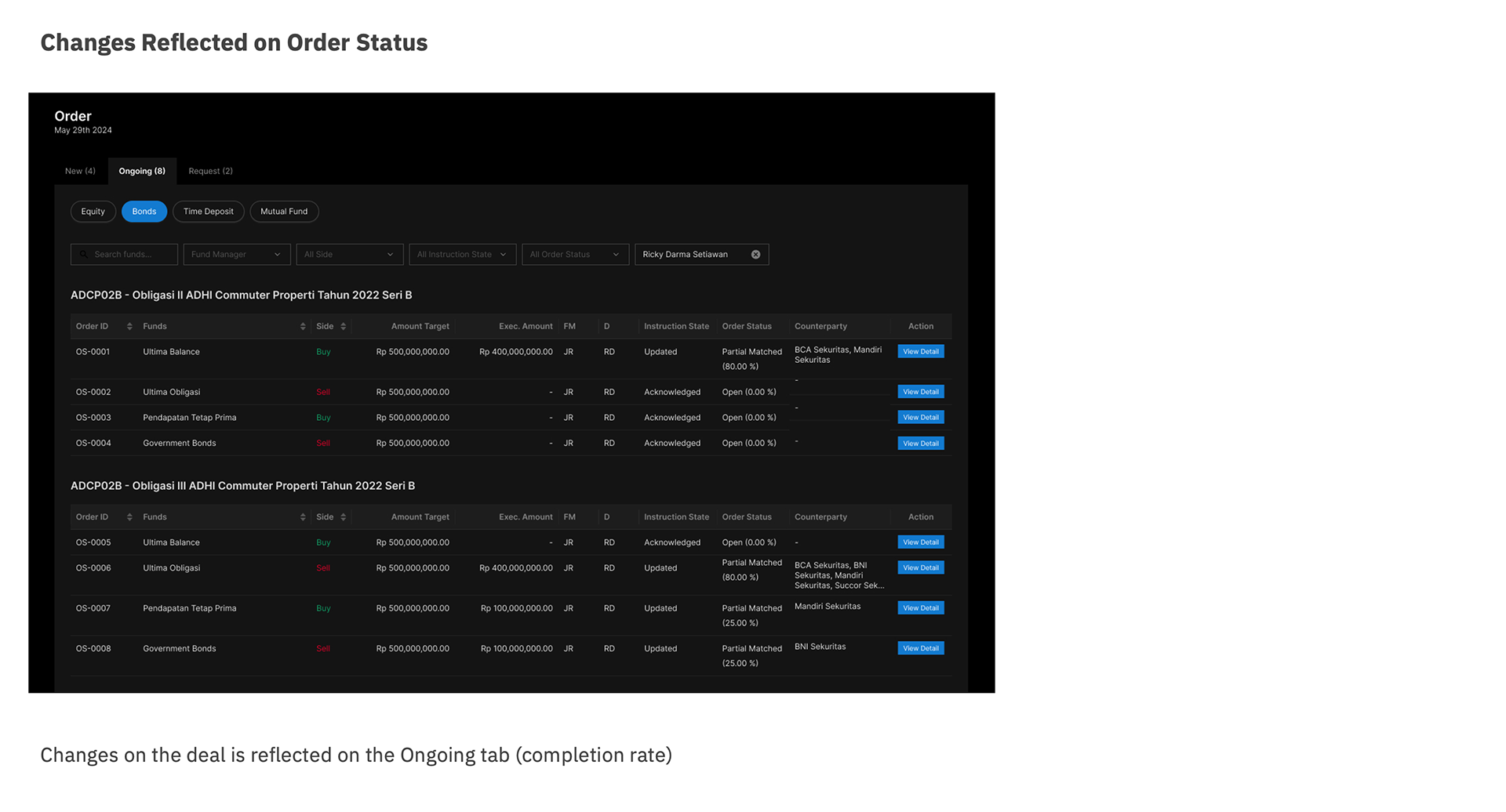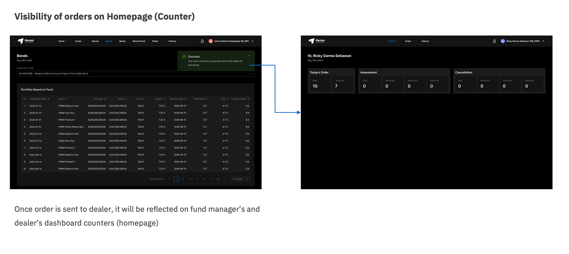 We created an ecosystem that integrates in-app notifications, ticket counters and order execution module that are visible to both fund managers and dealing teams. This enables them to keep track of the progress on order execution and completion rate in real-time.