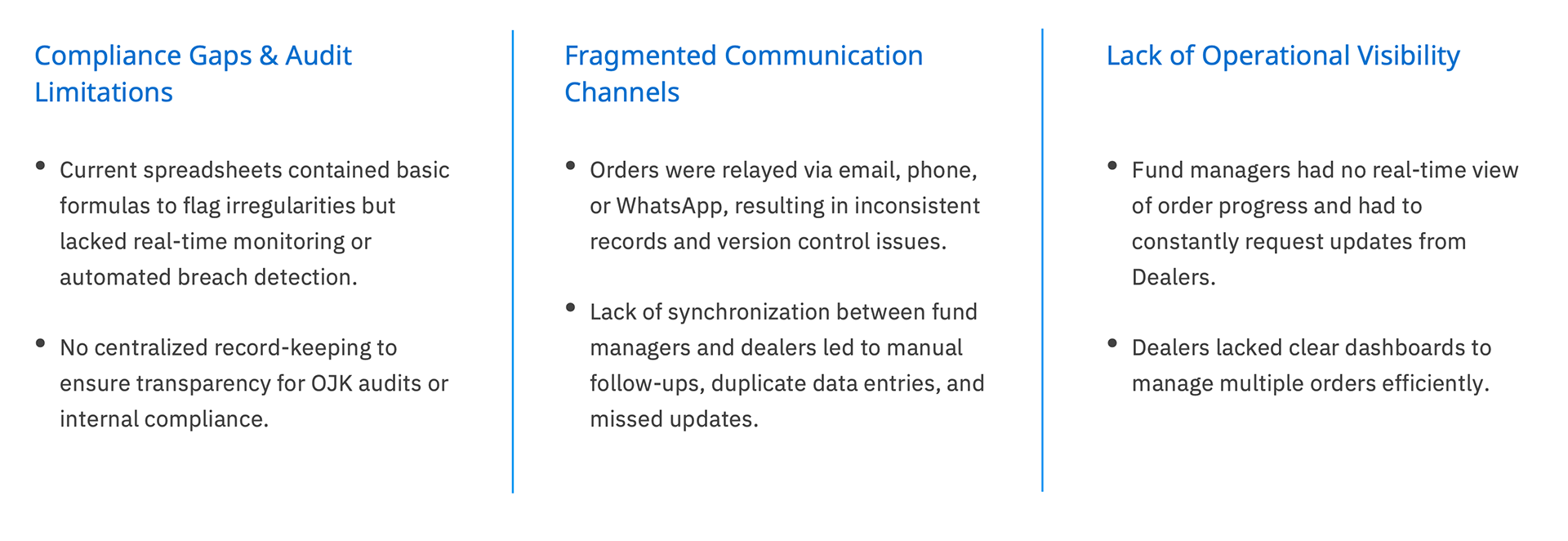 Despite the financial scale and regulatory sensitivity of their operations, the order management process remained highly manual.