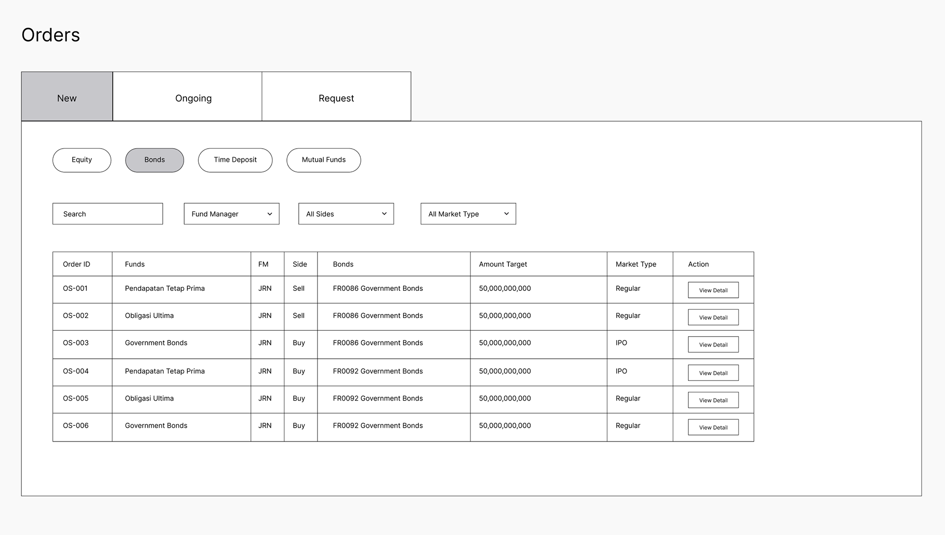 On the Ongoing tab, orders are separated by asset class (equity, bonds, time deposit) to keep access tailored to each fund manager's scope of responsibilities.