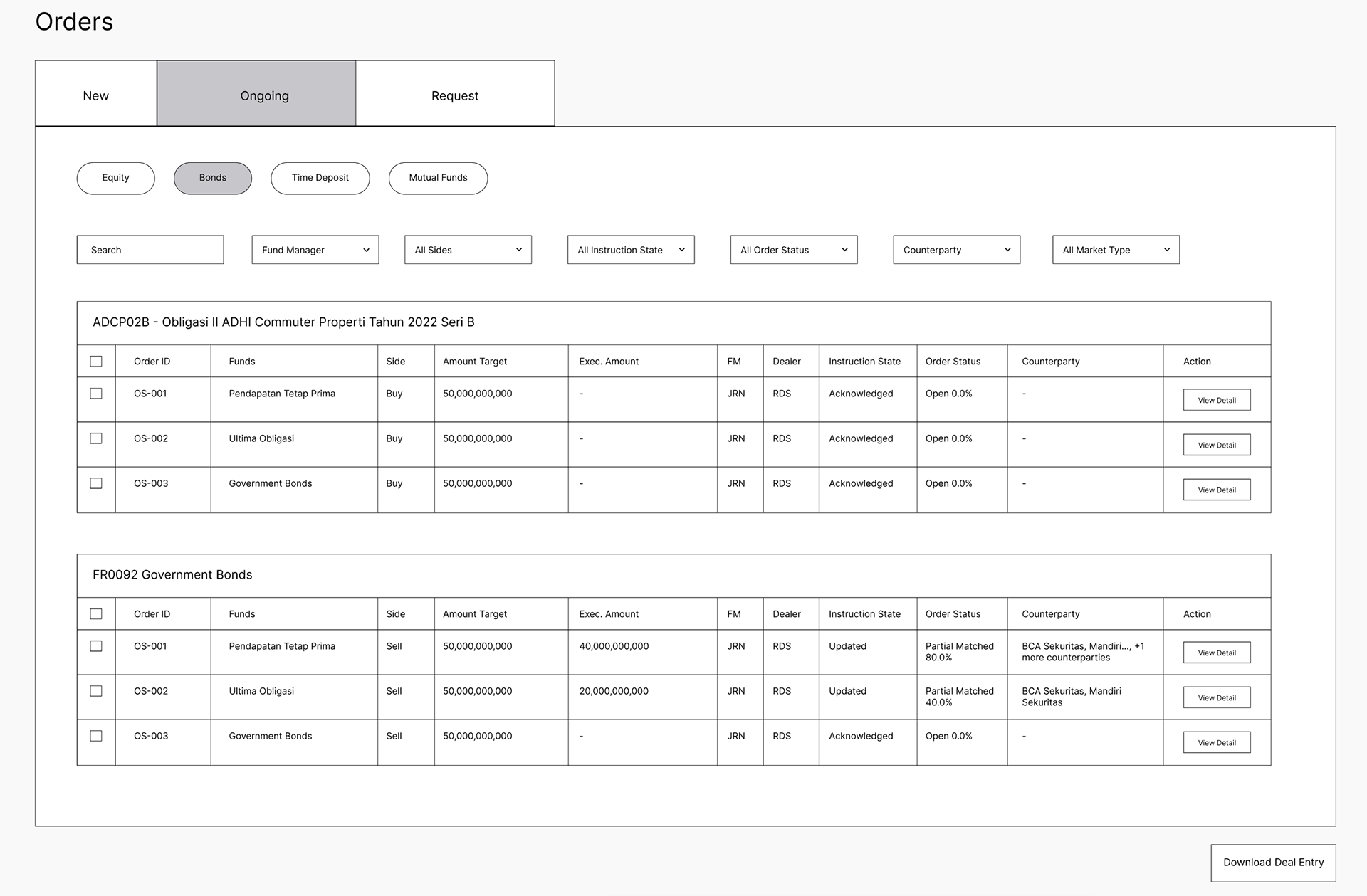 And on the order table, the orders are consolidated by bonds, where each group can contain multiple deals (nested).