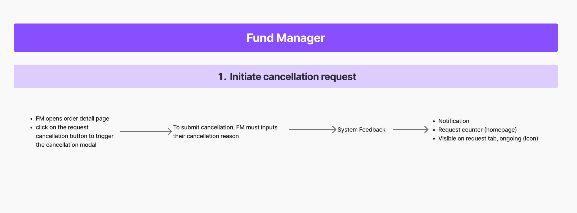 This is also part of feedback loop mechanism between Fund Manager and Dealer team. Unlike the amendment flow, no validation process is required to submit the request. However, its applicability is up to dealer's discretion because order that is almost complete can not be canceled anymore.