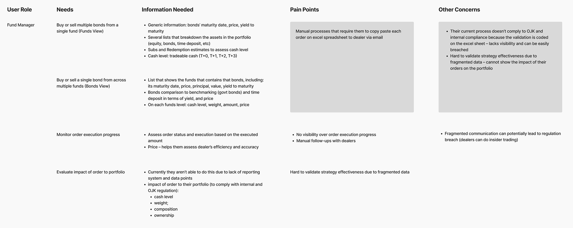 • Deep domain expertise – managing this project proved to be very challenging as it required me to learn financial market and industry regulation quickly. I have to learn their whole ecosystem (each team's workflow, tools and coordination with other departments) in order to produce a comprehensive system design that answers every possible scenario while also improving it in order to meets industry best practice and regulation.